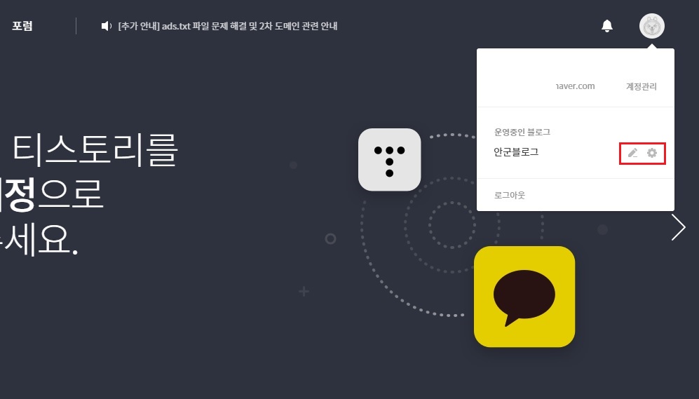 편집을 위한 페이지로 넘어 가기 위해서는 티스토리 홈페이지 메인화면으로 돌아가야 하는데 기본 스킨을 적용하게 되면 메인화면으로 가는 링크가 찾기가 쉽지 않습니다 네이버검색 후 다시 링크로 타고 들어가거나 혹은 자신의 블로그 오른쪽 하단의 TISTORY 를 눌러주면 메인화면 으로 넘어가게 되고 오른쪽 상단의 이모티콘을 누르게되면 톱니바퀴(설정)으로 들어갈 수 있습니다